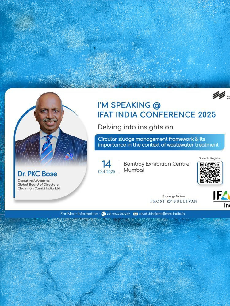 We are honored to welcome Dr. PKC BOSE, Executive Advisor to Global Board of Directors, Chairman, Cambi India Ltd., as a Panelist at IFAT India 2025! He will be sharing insights on โCircular Sludge Management Framework and its Importance in the Context of Wastewater Treatmentโ โ focusing on how innovative technologies, resource recovery models, and business frameworks can transform sludge from a burden into a valuable resource for energy, compost, and sustainable infrastructure.