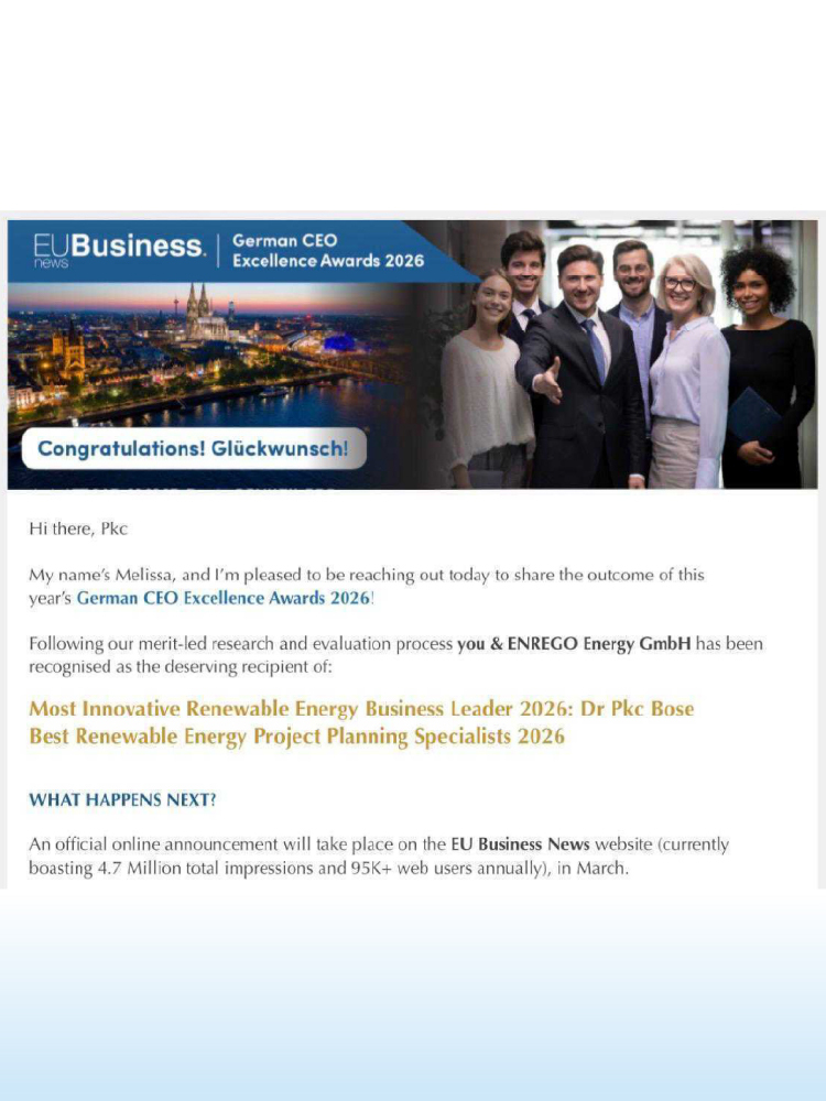 Recognised at the German CEO Excellence Awards 2026 for leadership and innovation in renewable energy. This milestone reflects our commitment to strategic planning, sustainability, and building a cleaner energy future.